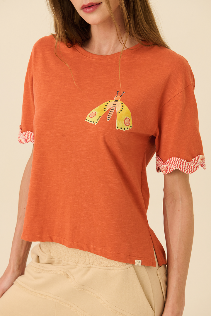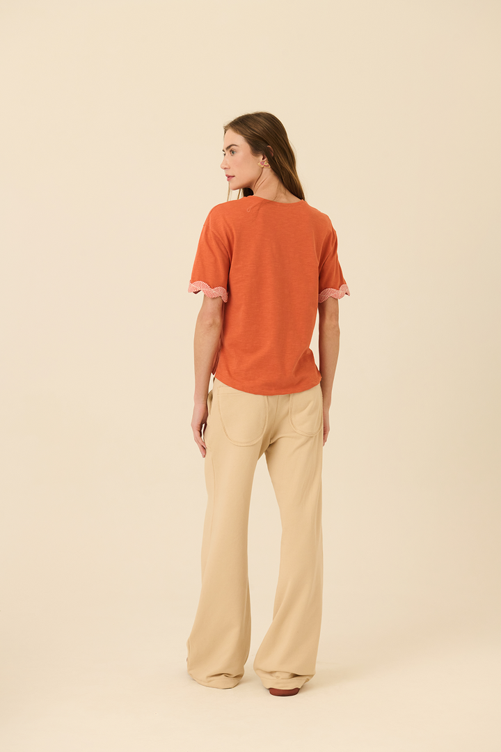 Descrição: Camiseta em malha flamê com acabamentos em renda de algodão nas mangas. A modelagem regular garante conforto e caimento leve. Ideal para composições casuais com um toque de sofisticação discreta.