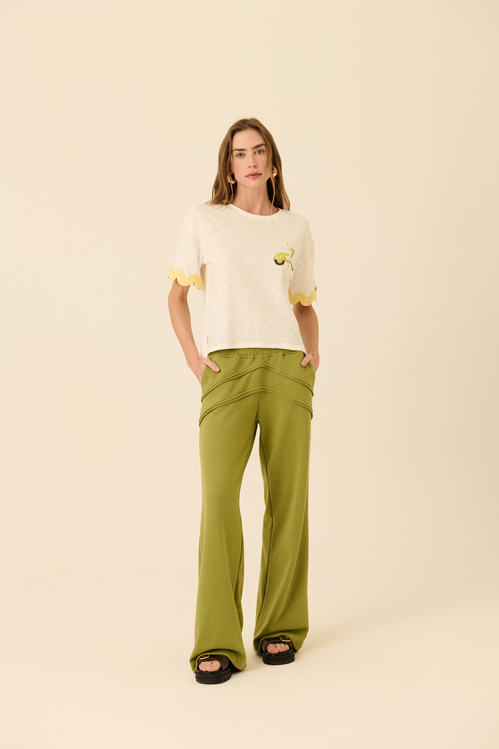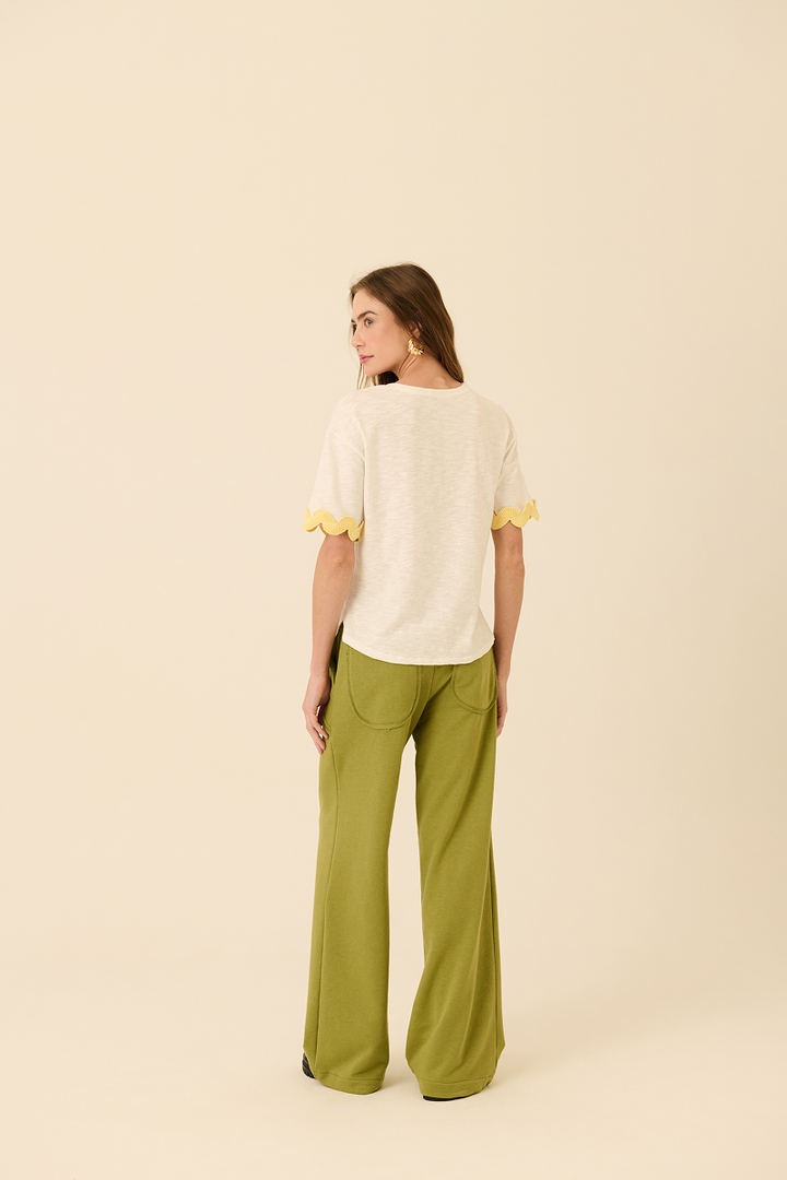 Descrição: Camiseta em malha flamê com acabamentos em renda de algodão nas mangas. A modelagem regular garante conforto e caimento leve. Ideal para composições casuais com um toque de sofisticação discreta.