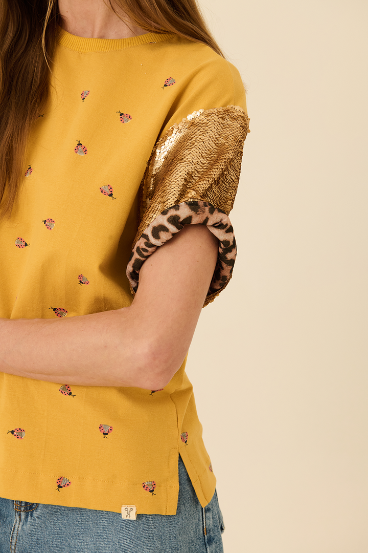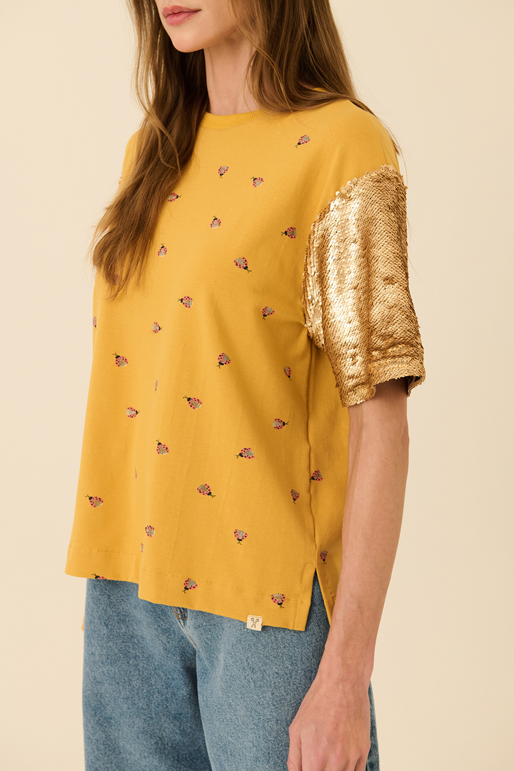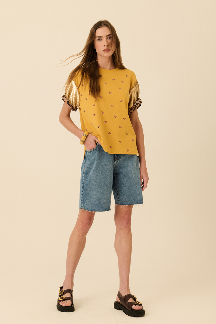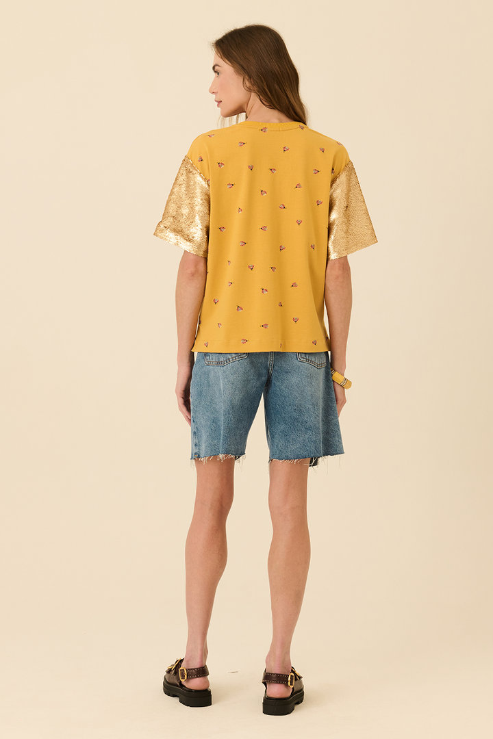 Descrição: Camiseta 100% algodão com modelagem ampla e mangas em paetê. O acabamento interno das mangas em renda estampada adiciona um toque delicado. Um equilíbrio entre brilho e conforto, ideal para produções contemporâneas.