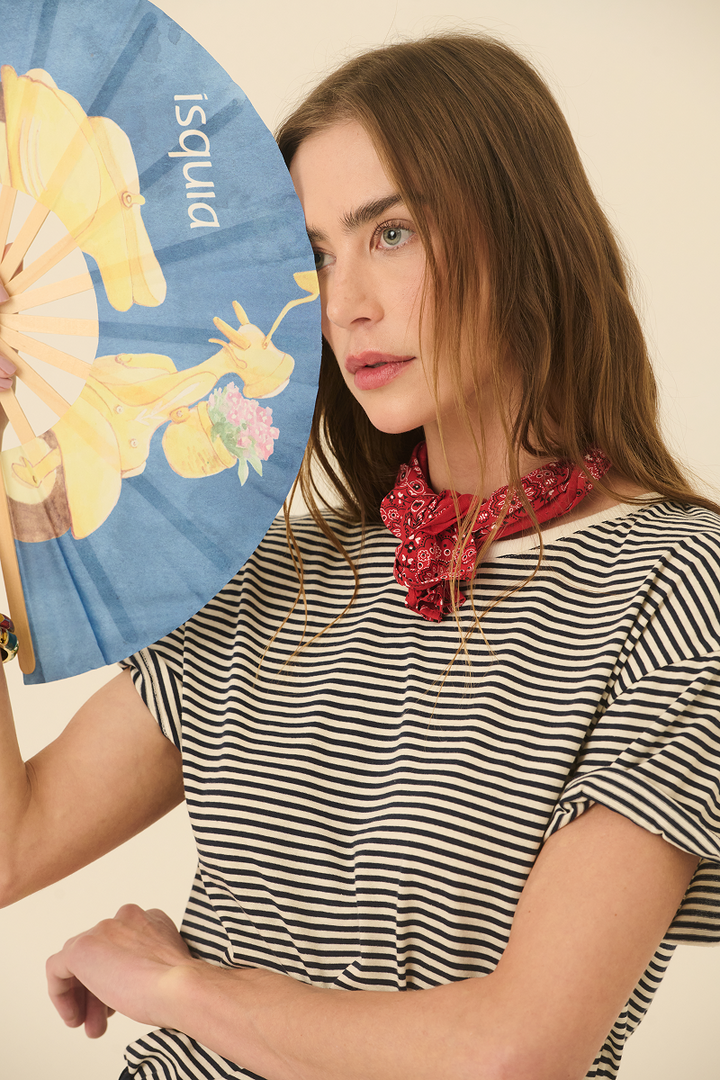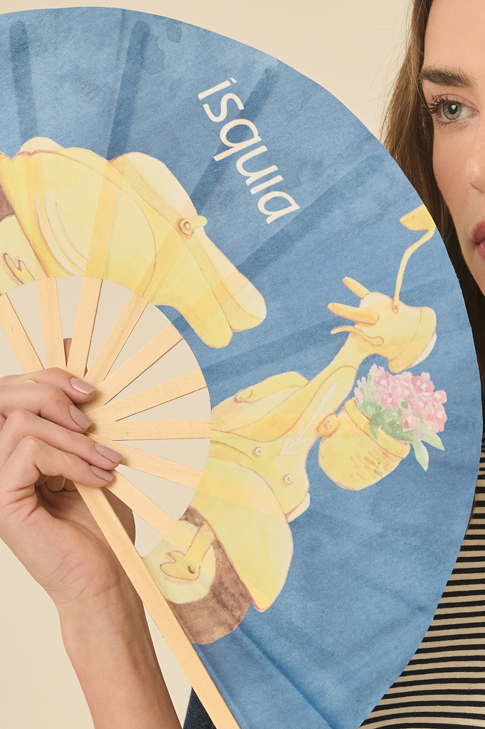 Leque de tecido com logotipo Ísquia em aquarela. Acessório artesanal, resistente à água e ao tempo. Feito à mão, possui base em madeira.